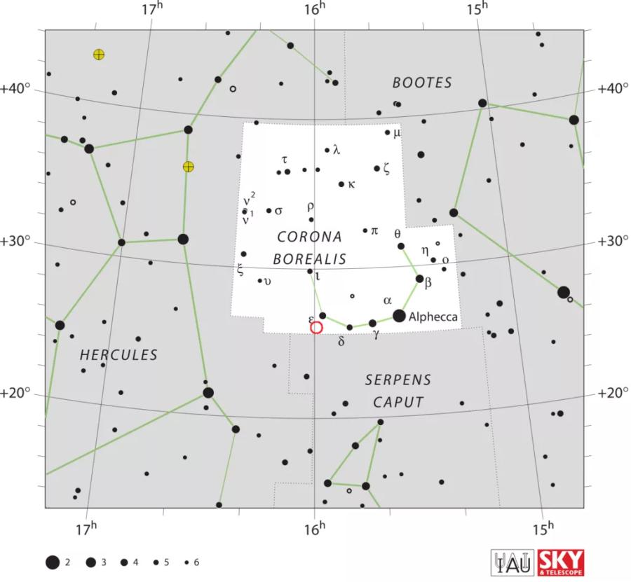 Для наблюдателей в Северном полушарии T Coronae Borealis будет видна между созвездиями Волопаса и Геркулеса. Достаточно найти характерную полукруглую форму Северной Короны — вспыхнувшая звезда появится в её восточной части.