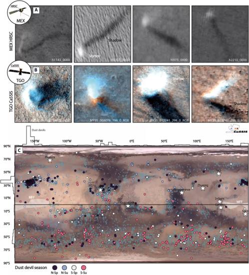 В новом исследовании ученые использовали методы глубокого обучения для анализа двух десятилетий орбитальных снимков, полученных с аппаратов Mars Express и ExoMars Trace Gas Orbiter. Это позволило отследить глобальное, суточное и сезонное перемещение пылевых вихрей по всей поверхности Марса, предоставив распределенную характеристику приповерхностных ветров.