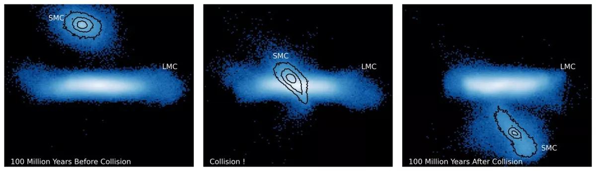 Новое исследование, основанное на гидродинамическом моделировании, показывает, что недавнее (около 100 миллионов лет назад) лобовое столкновение Малого Магелланова Облака (ММО) с Большим Магеллановым Облаком (БМО) привело к кардинальной перестройке структуры и кинематики меньшей галактики. Моделирование объясняет ключевые загадки ММO, такие как отсутствие вращения у старых звёзд при наличии сильного градиента скорости в газе, огромную глубину вдоль луча зрения и смещение фотометрического и кинематического центров.
